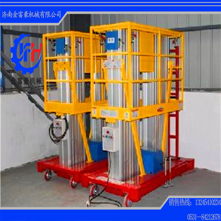 作時不傷 地面,可用于貼墻工作及探出作業(yè),工作無死角。單立柱式鋁合金電動升降機配上龍門跨架