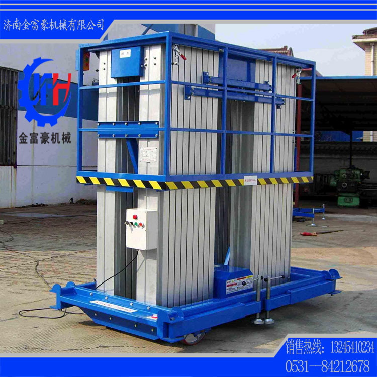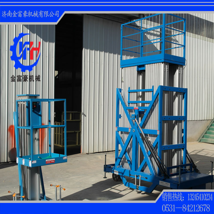 濟南金富豪機械設備有限公司生產的鋁合金升降平臺采用四桅柱式結構,穩(wěn)定性極好,運轉靈活,載重量大,平臺面積大,推行方便。它輕盈的外觀,能在極小的空間內發(fā)揮最高的舉升能力。使升降臺的偏轉與擺動極小??捎米麟娏€路、照明電器、高架管道等安裝維護,高空清潔等單人工作的高空作業(yè)。