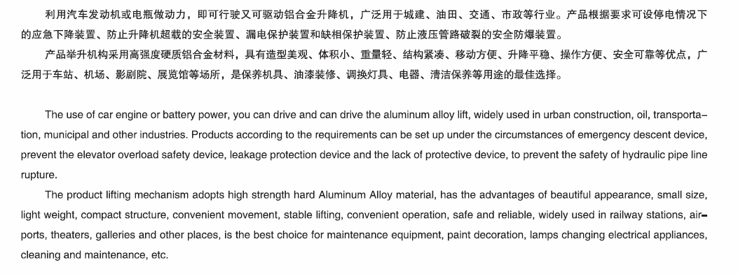 利用汽車發(fā)動機或電瓶做動力,即可行駛又可驅(qū)動鋁合金升降機,廣泛用于城建、油田、交通、市政等行業(yè)。產(chǎn)品根據(jù)要求可設(shè)停電情況下的應(yīng)危下降裝置、防止升降機超載的安全裝置、漏電保護裝置和缺相保護裝置、防止液壓管路破裂的安全防爆裝置